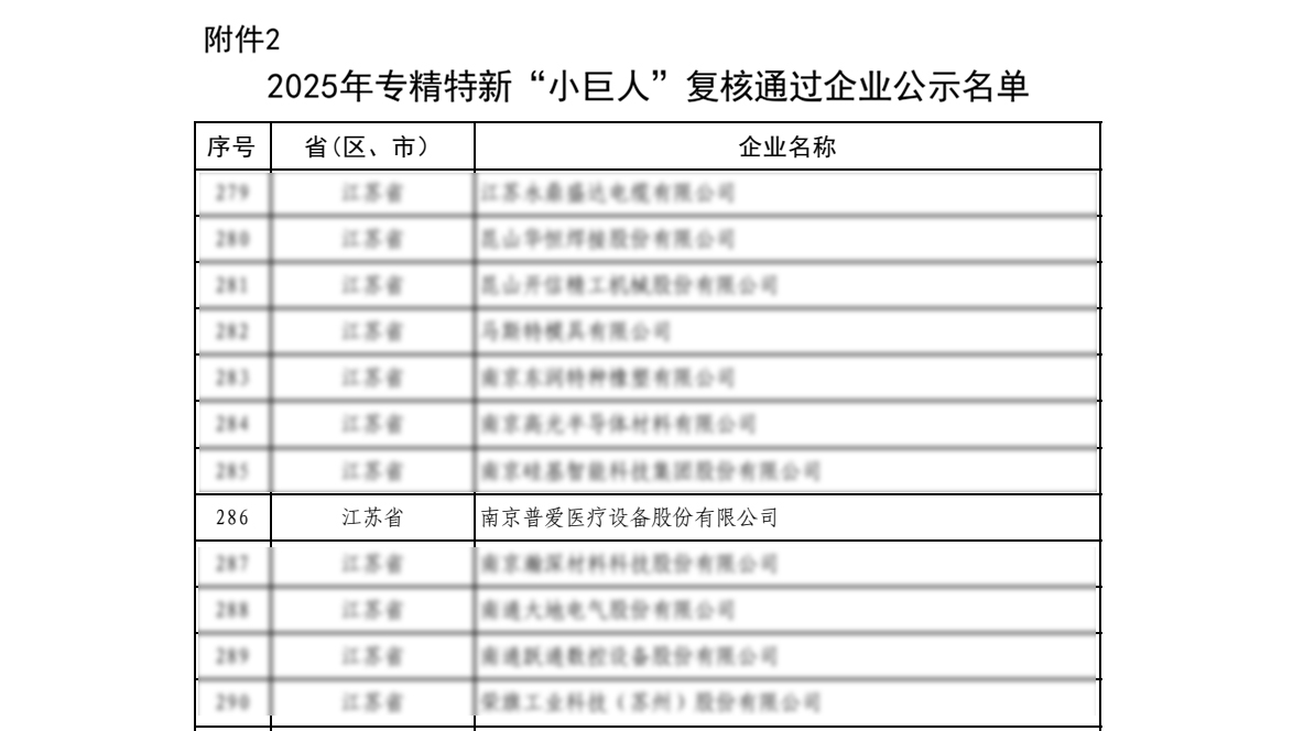 近日,工業(yè)和信息化部2025年專(zhuān)精特新“小巨人”企業(yè)復核結果公布,南京普愛(ài)醫療設備股份有限公司憑借22年深耕醫學(xué)影像與手術(shù)機器人設備領(lǐng)域的技術(shù)積淀和豐碩的自主創(chuàng )新成果,順利通過(guò)復審,持續保有國家專(zhuān)精特新“小巨人”企業(yè)榮譽(yù)稱(chēng)號。
